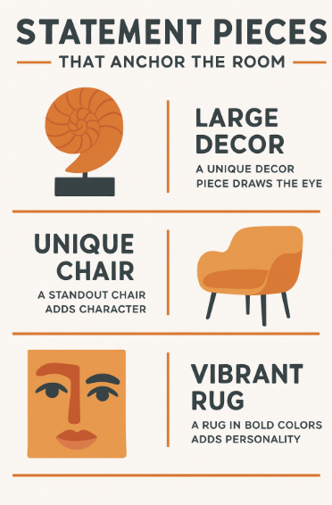 A bold rug, a giant piece of art, or a funky chair; just ONE piece can make your whole room look intentional. It’s like the lead singer in a band. The rest of the room? Backup dancers.